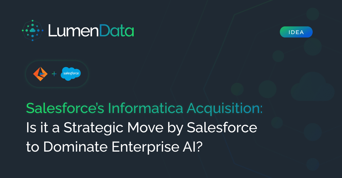 LumenData’s VP of Architecture, Vinayan Valappil, provides a compelling and valuable perspective on the recent Salesforce – Informatica acquisition news. Is it a calculative move by Salesforce to broaden its focus on enterprise AI? What will Salesforce gain from the acquisition deal? Learn here.