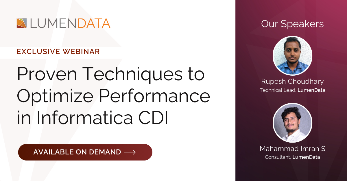 Even well-architected CDI environments can hit friction. The difference lies in how quickly and confidently your teams can course-correct. Watch LumenData’s exclusive webinar as our technical experts walk you through some of the best techniques to improve performance in Informatica CDI.